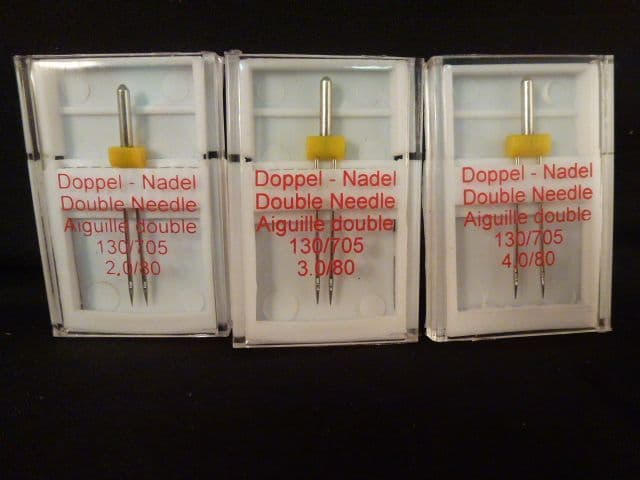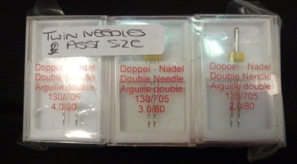 Assorted twin machine needles. 130/705 in sizes 2.0, 3.0 and 4.0 2 of each size per pack. 6 needles in total. These needles are specifically designed to create pintucks and also for using decorative stitches. Twin needles should always be used at reduced speed.